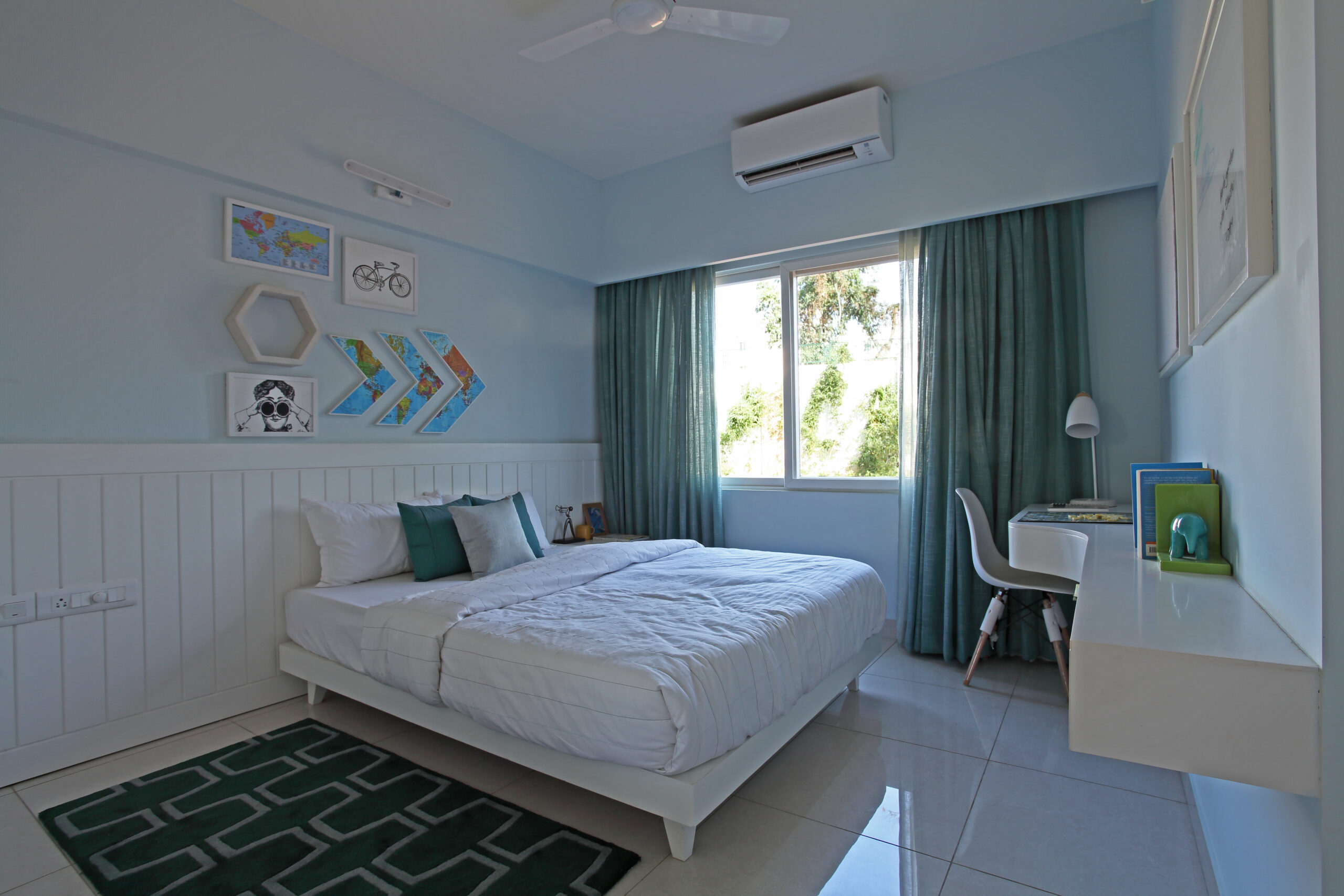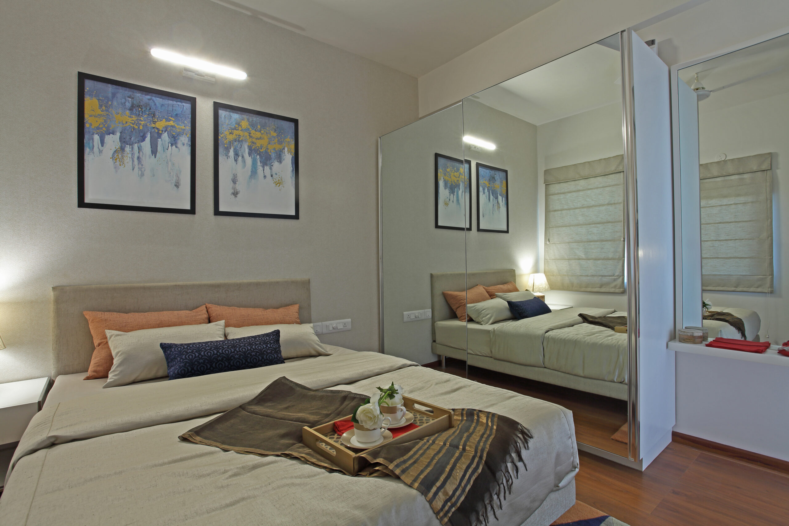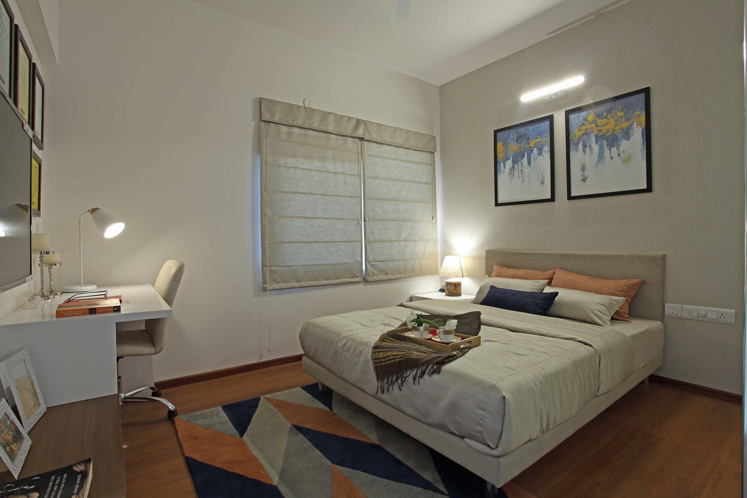 USP- A small apartment- interiors- designed to look and feel spacious by judicial arrangement of furniture,material specification,eclectic colours and appropriate sizing of furniture without compromising on ergonomics and within a restricted budget.