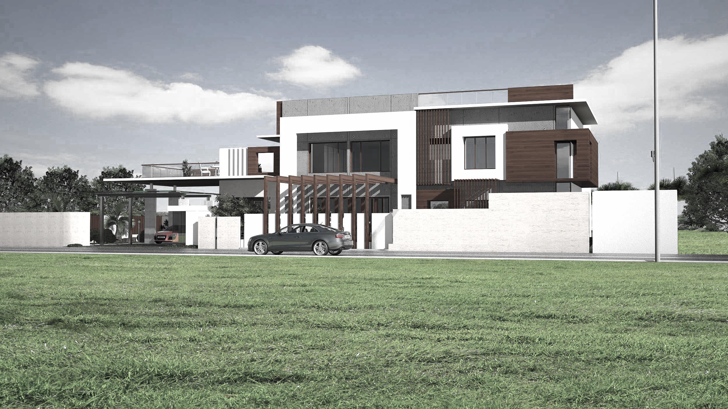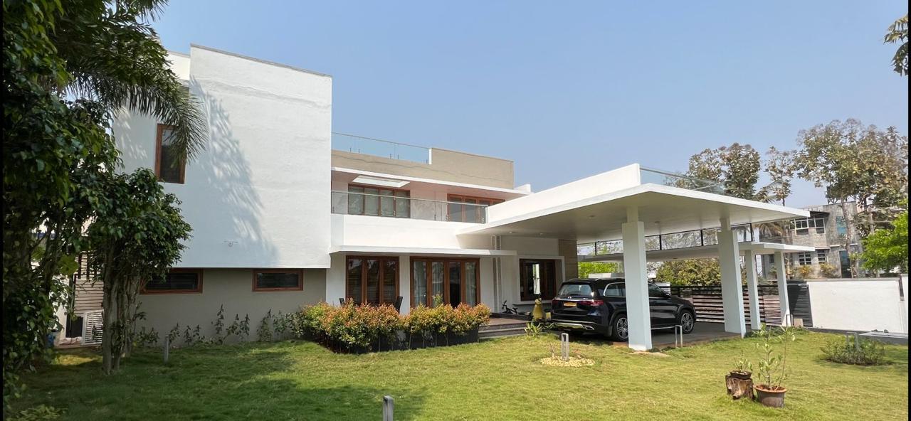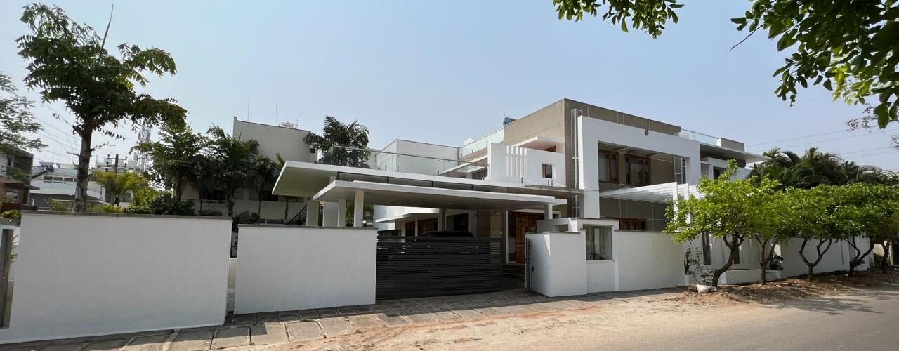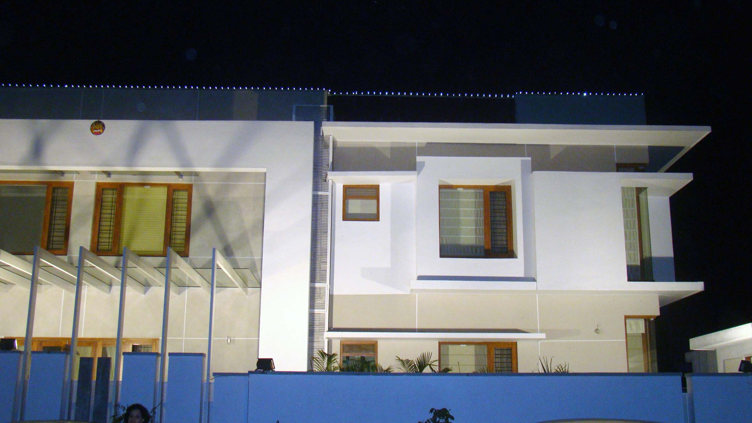The client’s requirement was to have a lavish, sustainable and contemporary five bedroom residence along with Home theatre, family, home gymnasium, formal and informal living etc., lots of open space to north east part of land for growing up children to play. Site is about half an acre and located in the most upcoming locality of Shimoga. As architects lot of importance was given to the scientific aspects of Vaastu at the design stage. Consideration was given to have view of landscaped areas all common areas. The spaces designed are luxurious in terms of volume and finishes without compromising on warmth of a home. Special attention was given to fenestrations to optimise the inside temperature of house.